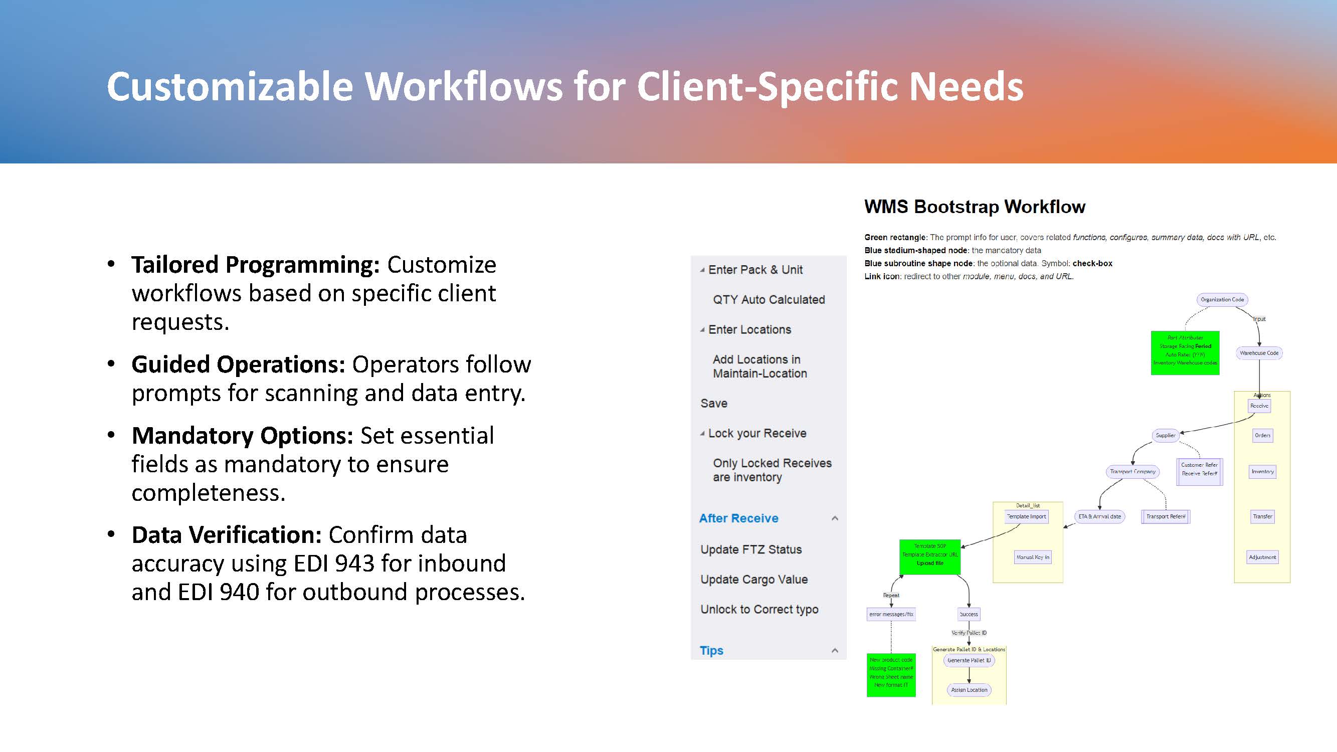 · Multi-Warehouse & Client-Specific Customization – Supporting multiple warehouse locations with tailored workflows to match industry-specific storage, handling, and fulfillment requirements.