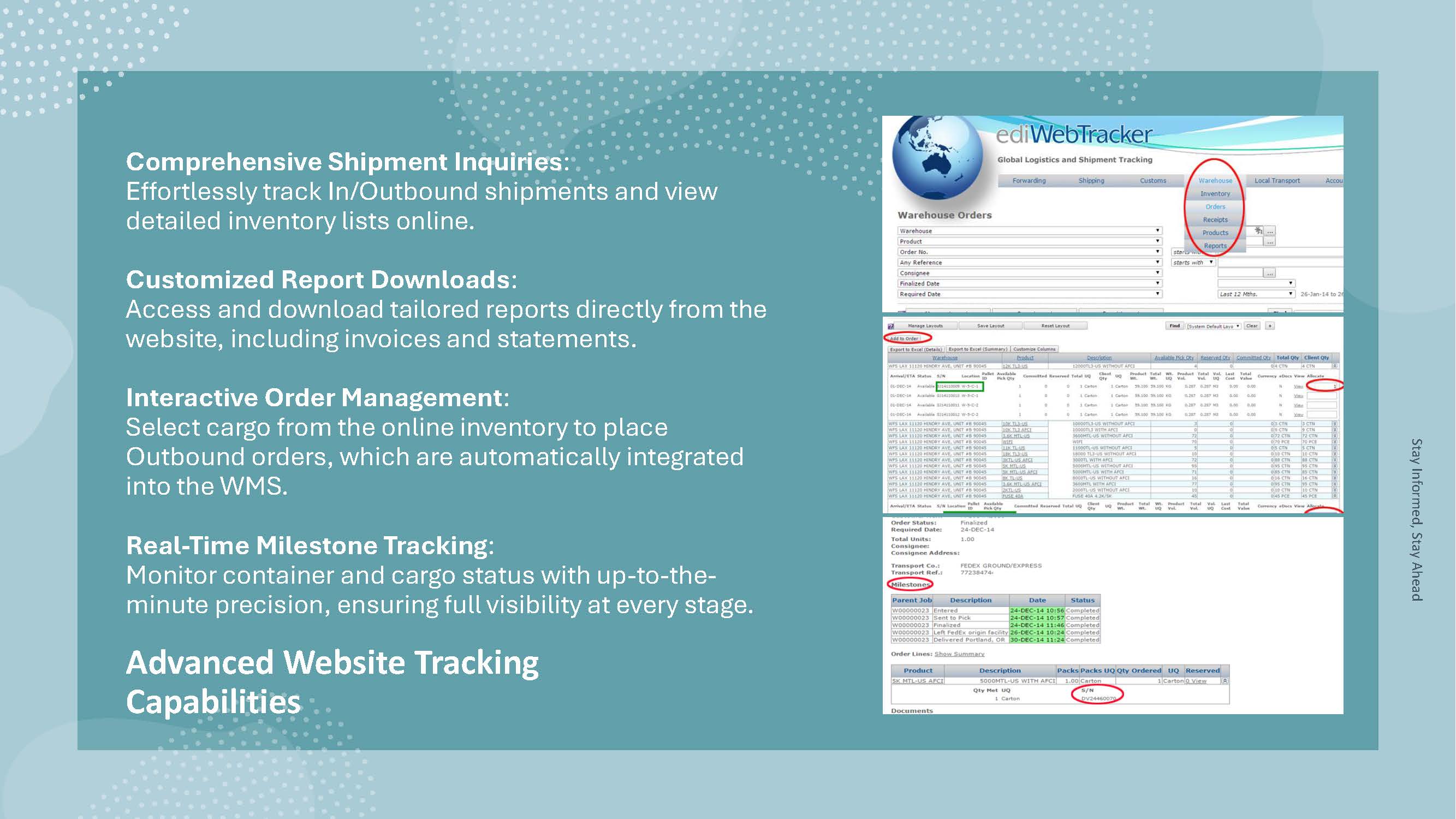 · Live Shipment Status Updates – Real-time tracking of cargo movements, inventory milestones, and transit schedules.