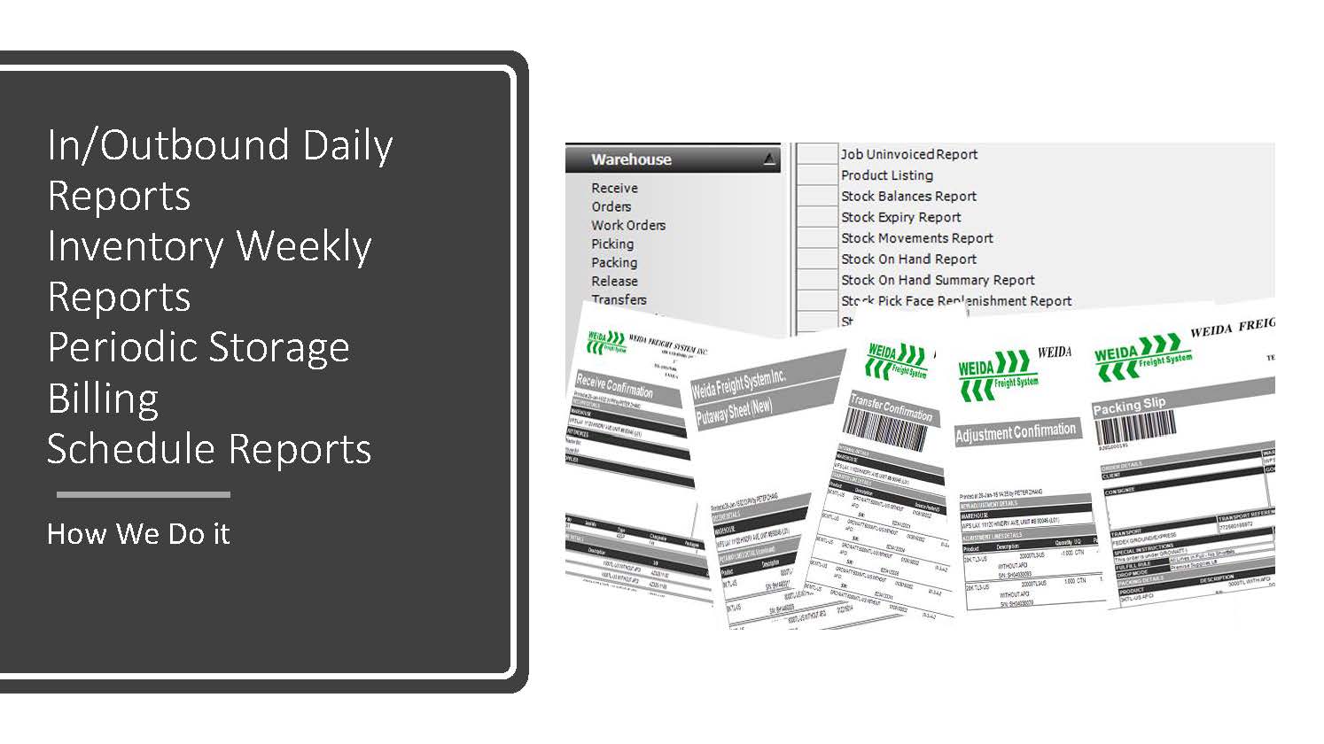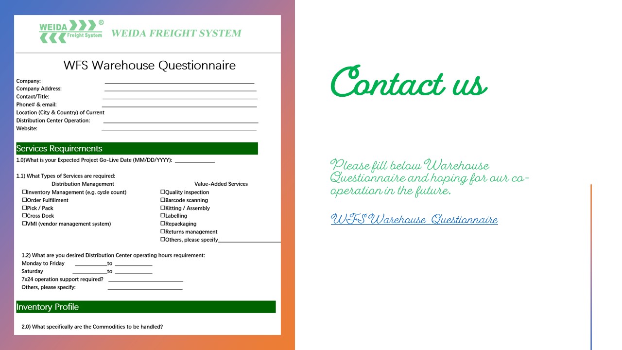 At Weida Freight System (WFS), we offer comprehensive warehouse services designed to meet the evolving needs of global supply chains. With over 4 million square feet of warehouse space strategically located across the United States, we provide efficient, secure, and scalable solutions for B2B, B2C, and e-commerce operations.