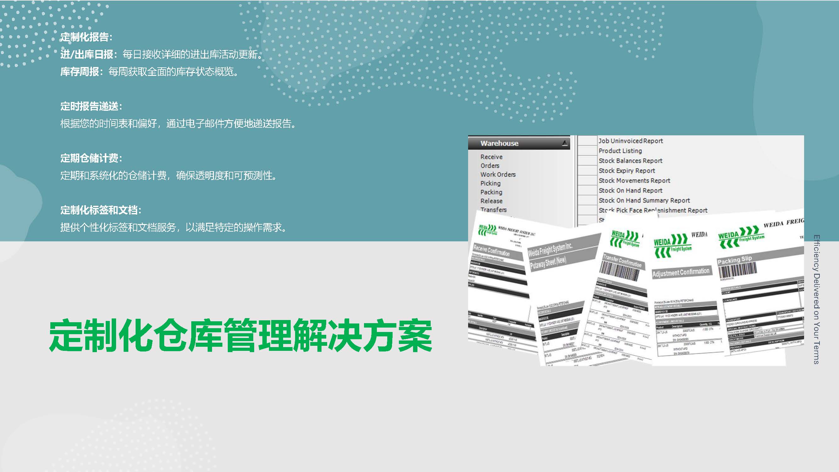 在威达国际供应链网络体系中(WFS),我们提供全面的仓储服务,以满足全球供应链不断变化的需求。我们在美国多个战略位置拥有超过400万平方英尺的仓储空间,为B2B、B2C和电子商务运营提供高效、安全且可扩展的解决方案。